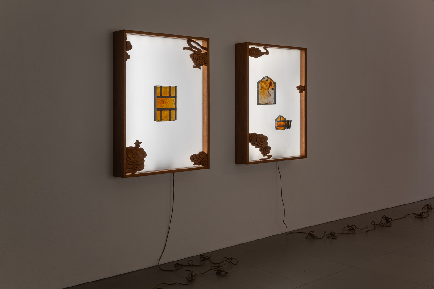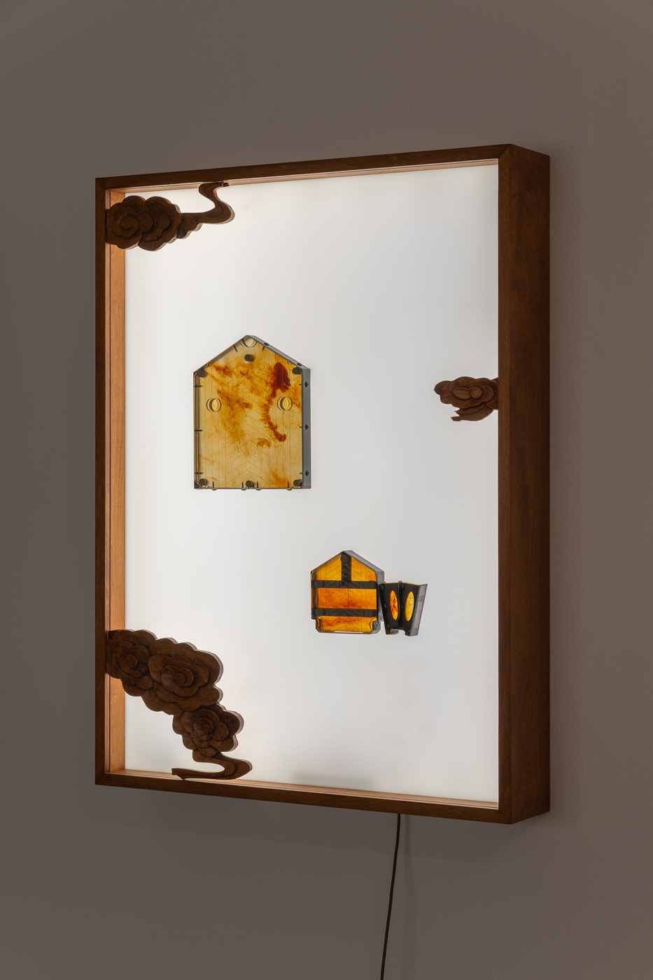 In the front gallery, vitrine works Tease 001, Tease 002 and Tease 003 reference both luxury retail displays and Chinese restaurant decorative motifs, reusing the ornaments the artist’s grandfather crafted when her family first opened the restaurant in Italy. Steel cutting moulds for leather bags encase an organic, marble-like material composed of gelatine, glycerine, restaurant grease and soy sauce – ‘skins’ derived from Mou’s earlier work Hung Out to Dry, Holding the Bag (2025–). Pressed into the moulds, the skins push against them, shrinking and sweating over time, caught between preservation and decay. In Tease, ornament is an excess frustrating the neutrality of utility, doubling as a device of seduction, dressed in a fantasy of terror and beauty all at once.